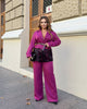 Комплект с декорирано сако – елегантен дамски костюм с удължено сако в прав силует и класическа яка, комбиниран с широки панталони. Идеален избор за ежедневни, делови и стилни визии, съчетаващ комфорт и елегантност.