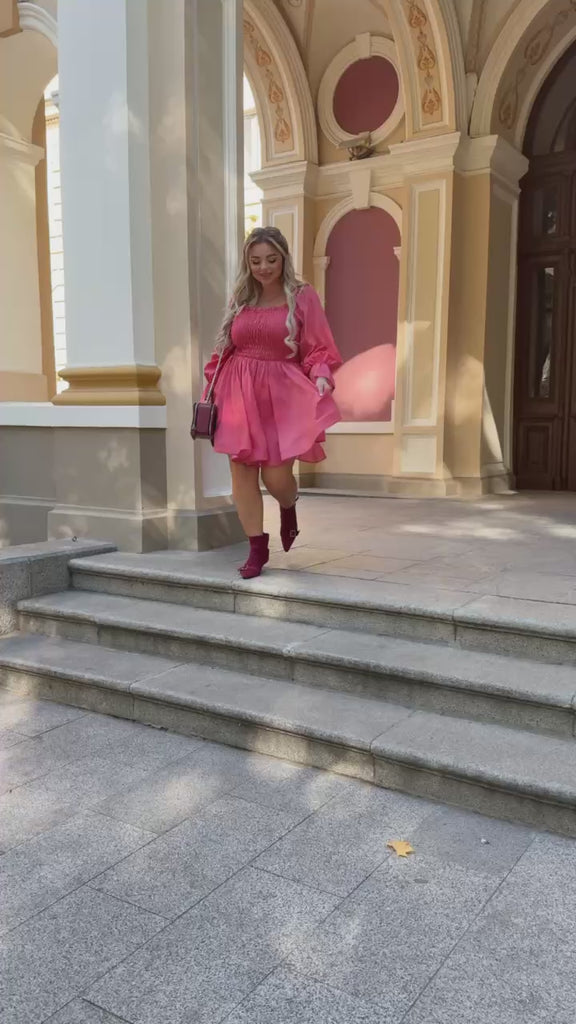 Къса рокля с блясък с отблясък, който изящно сияе на светлина. Комфортната кройка с ластици подчертава фигурата, без да ограничава движенията. Долната част е укрепена с регилин, който придава форма, обем и разкроен силует – всяка стъпка изглежда като от корица на списание.