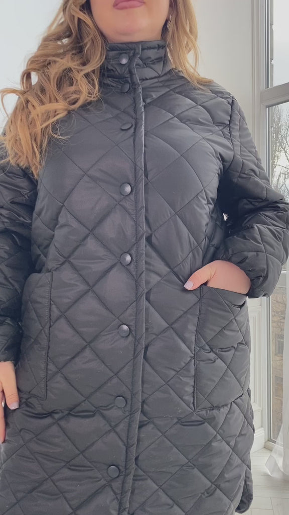 Капитонираното яке със средна дължина, висок яка и дълги ръкави с ластик съчетава комфорт и стил. Обемните джобове и заобленият подгъв с цепки добавят практичност, а универсалният дизайн лесно се комбинира както със спортни визии, така и с ежедневни тоалети.