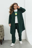 Панталоните са с права кройка, еластичен колан на талията и странични джобове, които съчетават стил и функционалност. Асиметричната жилетка с качулка и копче в центъра добавя интересен акцент, а удължената задна част и асиметрията на предната част оформят изискан и модерен силует. Динамиката и оригиналността на комплекта се подчертават от асиметрично разположените джобове.