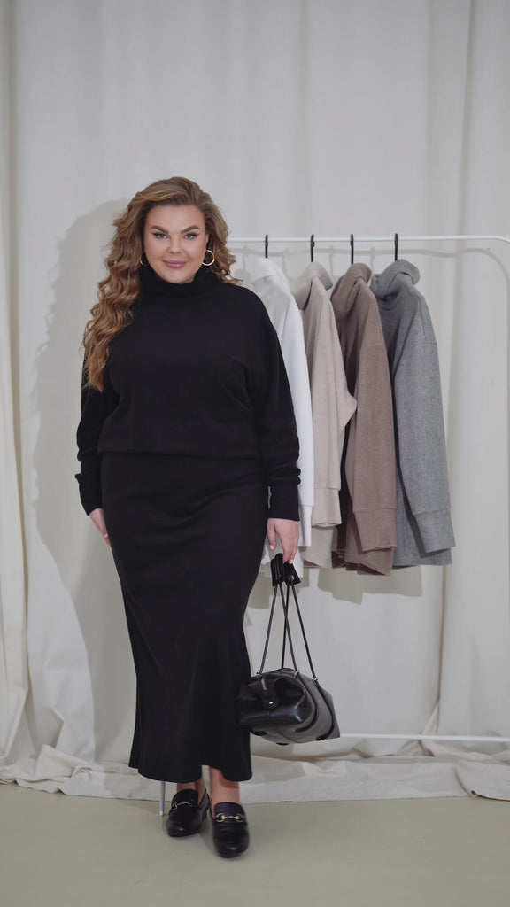 Елегантен комплект с пола от плътна и топла ангора – идеален избор за хладните дни. Горнището с изчистено деколте, спуснати рамене и маншет в долната част осигурява удобство и модерен акцент, а полата с елегантен втален силует и ластик в талията подчертава женствеността. Коланът не е включен в комплекта.