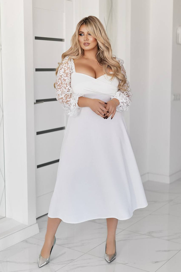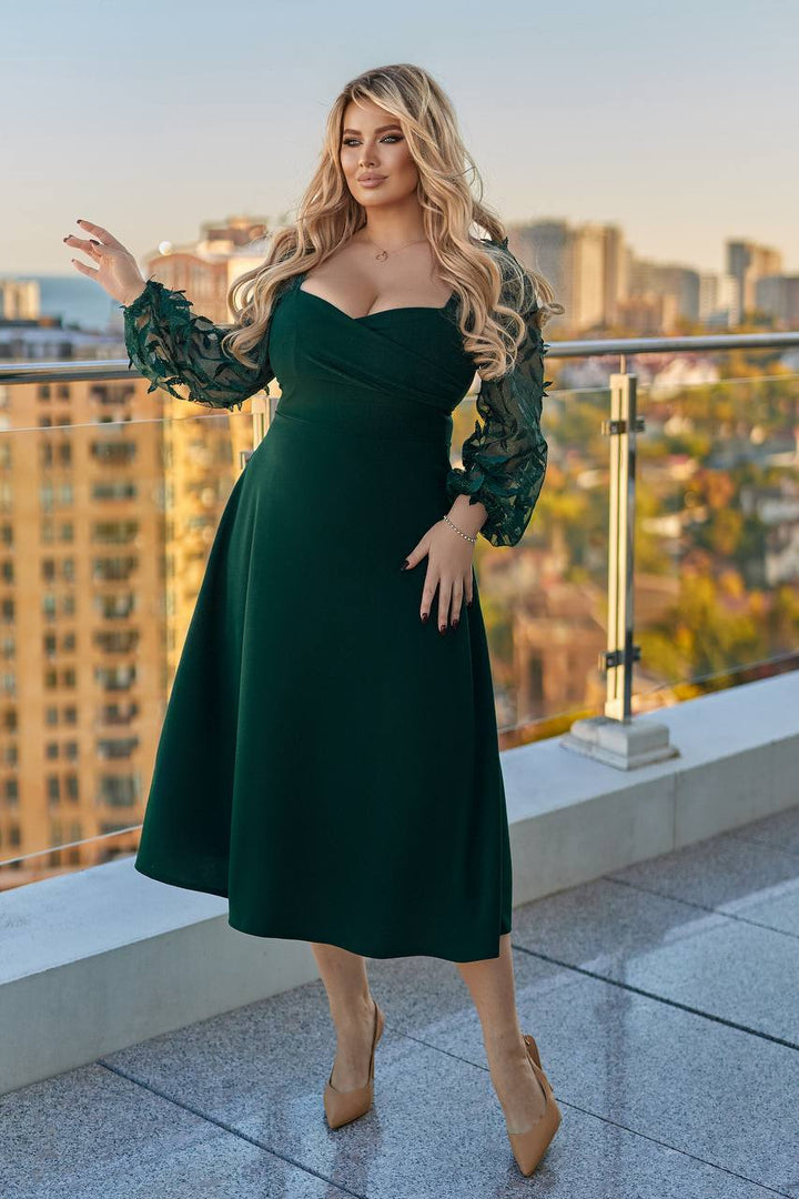 Рокля в миди дължина с изискана дантела и мрежа, декорирана с пайети, която придава блясък и елегантност. Моделът е изработен от крепдайвинг, осигуряващ удобство и свобода на движение. С дължина до миди и практична цип на гърба, роклята е лесна за обличане. В красив цвят, тя е перфектен избор за специални поводи и вечерни събития.