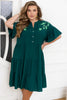 Рокля в свободна кройка от нежен софт, идеална за топлите слънчеви дни. V-образно деколте с елегантна яка подчертава шията и добавя изтънченост. Отпред — декоративни копчета за стилен акцент. Ръкавите тип „крилцa“ придават лек и романтичен вид, а полата с три волана се движи ефирно при всяка крачка. На раменете — деликатна щампа със сакура за нежен завършек. Моделът разполага и със странични джобове. Подходяща за тези, които ценят удобството и женствеността. На модела е размер 4XL–5XL.