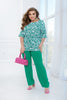 Комплект с блуза на цветя. Удобен и стилен комплект с свободен крой. Блузата е удължена, без закопчавания и джобове, с връзка през талията, която може да се регулира. Цепки отстрани и полукръгло деколте добавят лекота и елегантност. Панталоните имат висока талия с вшита еластична лента, а страничните джобове са скрити в шевовете, за допълнителен комфорт и стил.