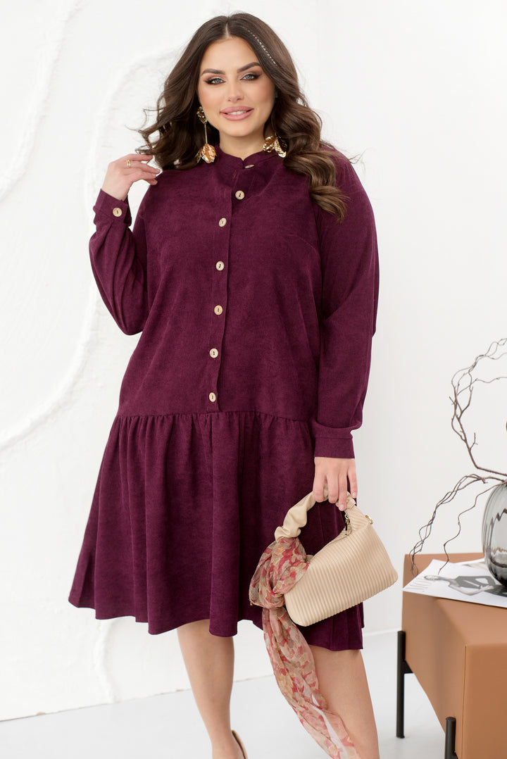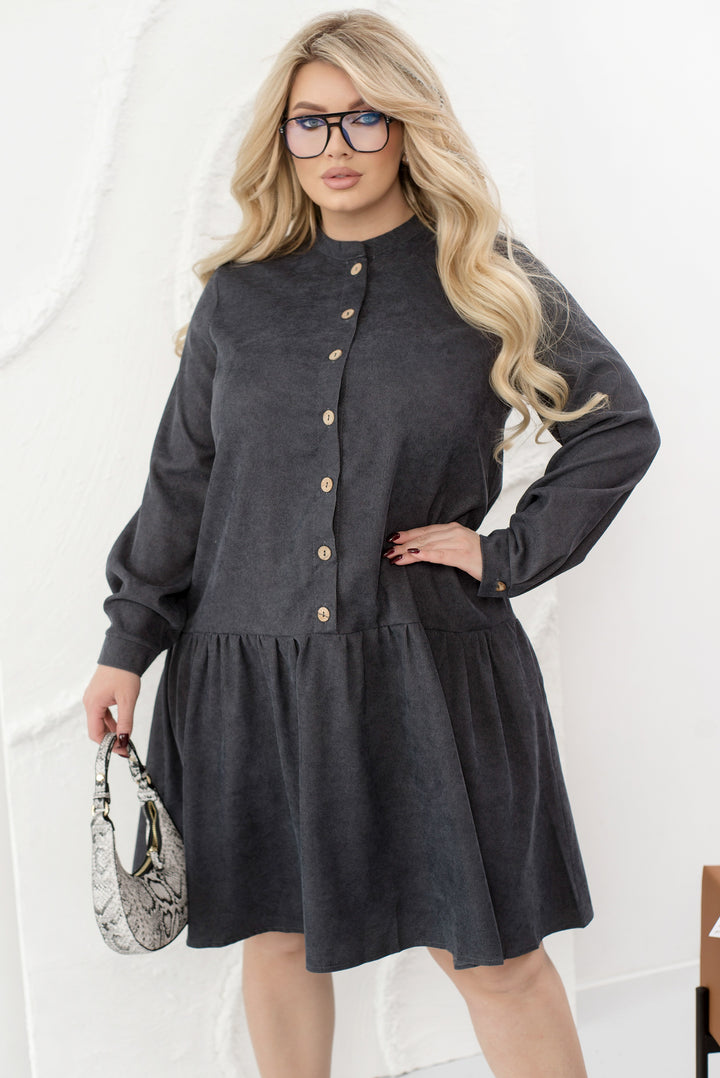 Изработена от мека кадифена материя, тази женствена рокля ще ви накара да изглеждате стилни, модерни и изискани. Моделът е допълнен от стояща яка, дълги ръкави с маншети и ефирен закачлив волан. Роклята се закопчава с ред копчета отпред в центъра.