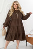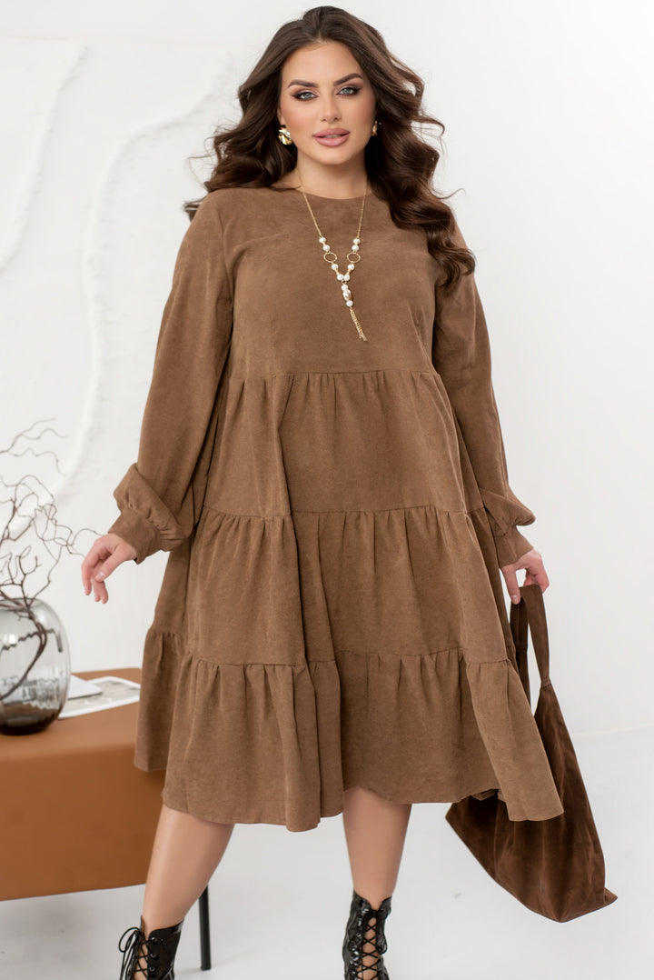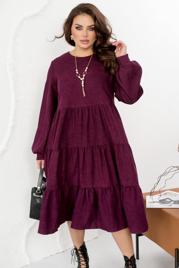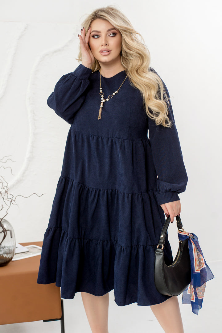 Ефирна рокля с А-силует, изработена от меко кадифе, ще ви позволи да изглеждате женствени и привлекателни дори в хладно време и сезони. Моделът е завършен с дълги ръкави с маншети и закопчаване с малко копче под врата. Летящият подгъв, състоящ се от няколко слоя волани, ще направи визията ви изразителна и незабравима.