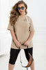 Комплект от тениска и скъсен панталон в стил oversize. Удължената тениска има спусната линия на раменете и къси ръкави. Кръглото деколте придава изчистен и елегантен вид. Панталоните с удобен широк ластик осигуряват комфорт през целия ден. Този комплект е перфектен избор за горещото лято и е наличен в разнообразни цветове, подходящи за всеки вкус. На модела е показан размер 2XL-3XL.