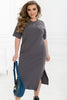 Миди рокля с цепка. Базова рокля-тениска с права кройка, кръгло деколте и къси ръкави с маншети. Роклята е украсена с надпис от камъни. Свободният крой и базовите цветове създават минималистичен и удобен стил. Коланът не е включен в комплекта.