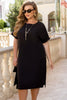 Къса лятна рокля с прав крой и дължина миди. Подходяща както за офис, така и за вечерни събития. Късият ръкав с маншети осигурява комфорт и елегантност. В комплект с текстилен колан, който подчертава талията. Манекенката е облечена в размер 2XL-3XL.