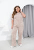 Комплект от тениска и панталон. Тениската е със свободна кройка, класическо кръгло деколте и къс ръкав с ниска линия на рамото за максимален комфорт. Панталоните са с права кройка, еластична талия и странични джобове, осигуряващи удобство и свобода на движенията. Подходящ за разходки, почивка у дома или срещи с приятели. Моделът носи размер 4XL–5XL.