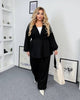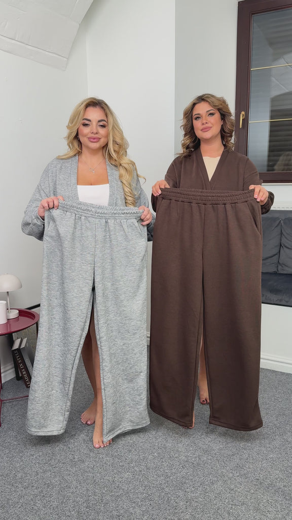 Комплект двойка от двулицева ангора — топъл и приятен на допир. Горнището е без закопчаване, с колан от същата материя в комплекта, а панталоните са свободни и удобни за всекидневно носене.