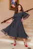 Разкроена рокля с десен на точки, с ефектни детайли от мрежа в горната част и в долната част на ръкавите. Ръкавите са 3/4 с нежни волани за допълнителен стил. Включен колан, който подчертава талията и придава завършен вид на тоалета.