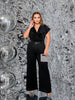 Елегантен черен гащеризон с пайети върху кадифе – перфектният избор за вечерни събития и празнични поводи. Съчетава стил и комфорт, като подчертава силуета с еластична материя, която осигурява перфектно прилягане. Широките крачоли придават изисканост, а включеният колан допълва визията с фин завършек.