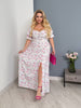 Дълга рокля на цветя от софт-коприна. Дължина 147 см, ръкав 34 см. Връзките в зоната на бюста позволяват оформяне на деколтето според предпочитание, а връзката на гърба регулира вталяването.