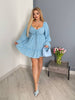 Къса крепирана рокля на цветя от нежна, копринена материя без еластичност. Дължината се регулира с връзки отпред, а шнуровката отзад позволява коригиране на талията. Ластикът на раменете се разтяга при обличане. Стандартна дължина – 87 см, възможен диапазон от 85 до 92 см.