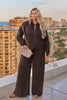 Елегантен дамски комплект от мек стреч велур премиум качество. Кройката е удобна и свободна, подходяща за всякакъв тип фигура. Панталоните са с пълна дължина и прав силует. Идеален избор както за делови срещи, така и за ежедневието.