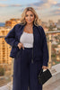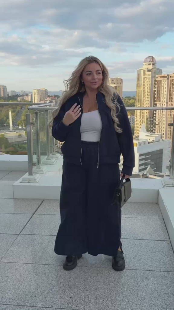 Елегантен дамски комплект от мек стреч велур премиум качество. Кройката е удобна и свободна, подходяща за всякакъв тип фигура. Панталоните са с пълна дължина и прав силует. Идеален избор както за делови срещи, така и за ежедневието.