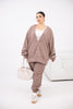 Комплект от две части с потник, изработен от рипсено кадифе. Костюмът е с дълбоко триъгълно деколте, при което потникът се подава елегантно, а панталонът е с ластична талия и маншети в долната част. Потникът е от силно еластична материя (над 20 см разтегливост), като при разтягане е възможно леко скъсяване на дължината.