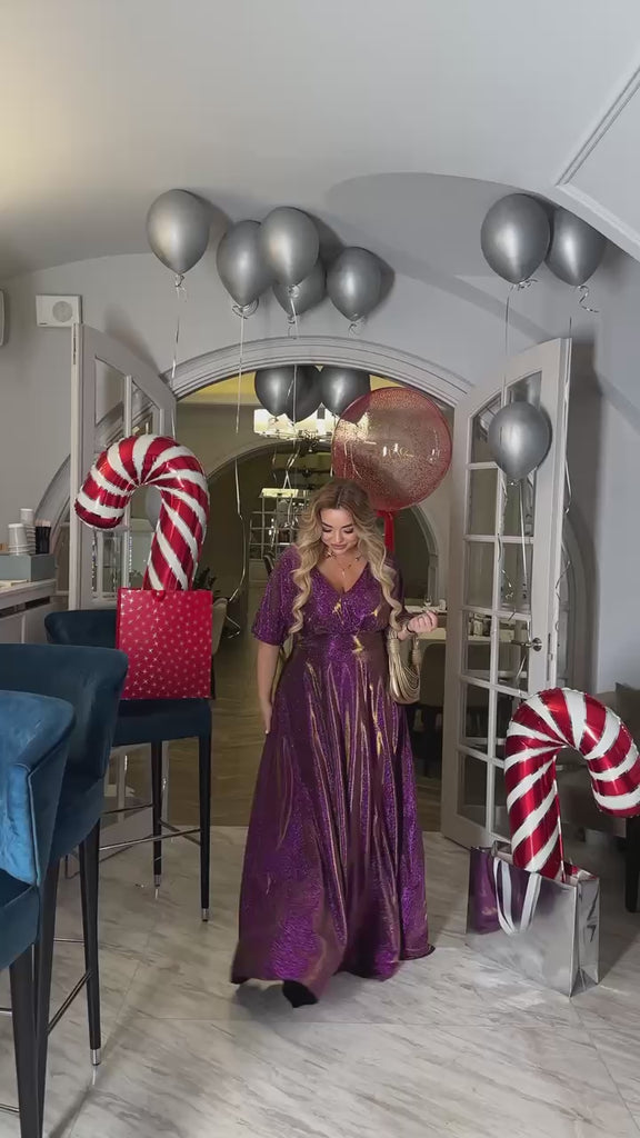 Луксозна рокля от блестяща материя с изискана визия и елегантен дизайн, перфектна за специални поводи и официални събития. Разкроен силует с корсетна талия създава изящен контур, а V-образното деколте добавя елегантност. Налична в разнообразие от цветове, тя ще подчертае вашата уникалност на всяко събитие.