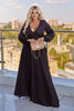 Дълга рокля с елегантен дизайн. Материята е лека и нежна, като придава на роклята изискан и луксозен вид. Роклята има V-образно деколте и дълги ръкави, които се стесняват на китката с маншети. На гърба има скрит цип за лесно обличане. Дължината на роклята е 150 см, а ръкавите са с дължина 65 см. Тази рокля е идеален избор за вечерни събития и официални поводи.