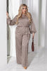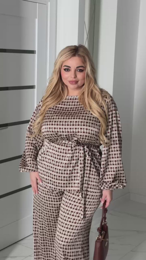 Комплект от сатен с елегантна блуза с колан и широки панталони. Панталоните са с практични джобове и ластик на талията. Материята не е еластична и запазва своята изискана форма.