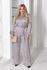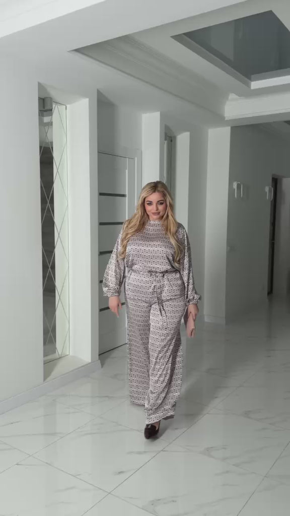 Комплект от сатен с елегантна блуза с колан и широки панталони. Панталоните са с практични джобове и ластик на талията. Материята не е еластична и запазва своята изискана форма.