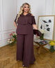 Стилен и ефектен комплект с модерна визия. Състои се от свободен топ с къс ръкав и волан около деколтето, комбиниран с широки панталони с висока талия и леко разкроени крачоли, които създават усещане за лекота и движение.