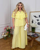 Стилен и ефектен комплект с модерна визия. Състои се от свободен топ с къс ръкав и волан около деколтето, комбиниран с широки панталони с висока талия и леко разкроени крачоли, които създават усещане за лекота и движение.