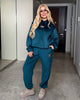 Стилен спортен комплект за разходки – oversize модел с худи, регулируемо чрез връзки в долната част, което позволява да се носи както удължен, така и повдигнат. Изработен от велур, който след пране запазва формата и качеството си – не се намачква, не се топи и остава изключително удобен и комфортен. Идеален избор за всеки ден и всякакви поводи!