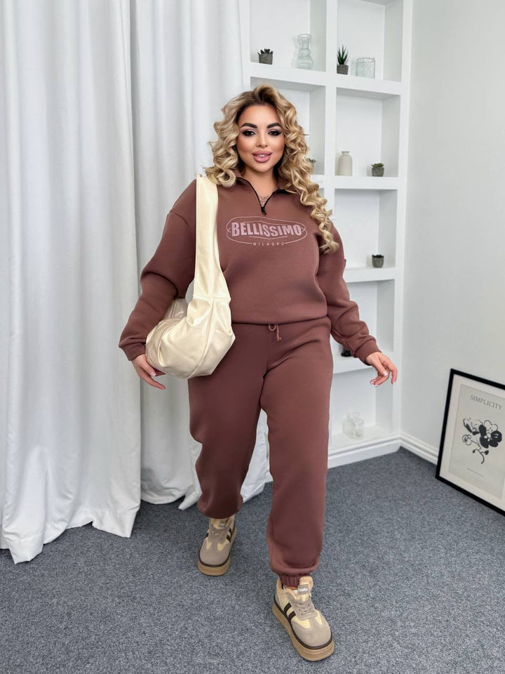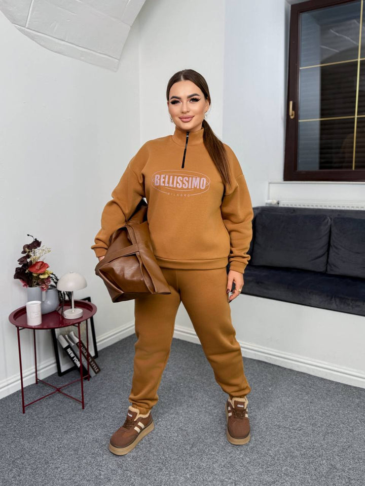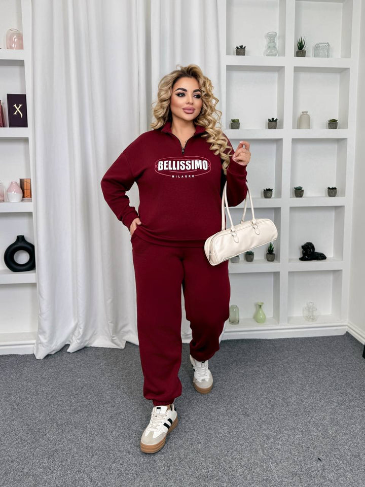 Овърсайз спортен комплект с висококачествен принт – модерен и удобен. Горнището е с късо закопчаване отпред, а панталоните са с маншети и странични джобове. Идеален избор за стилна визия и комфорт в ежедневието.