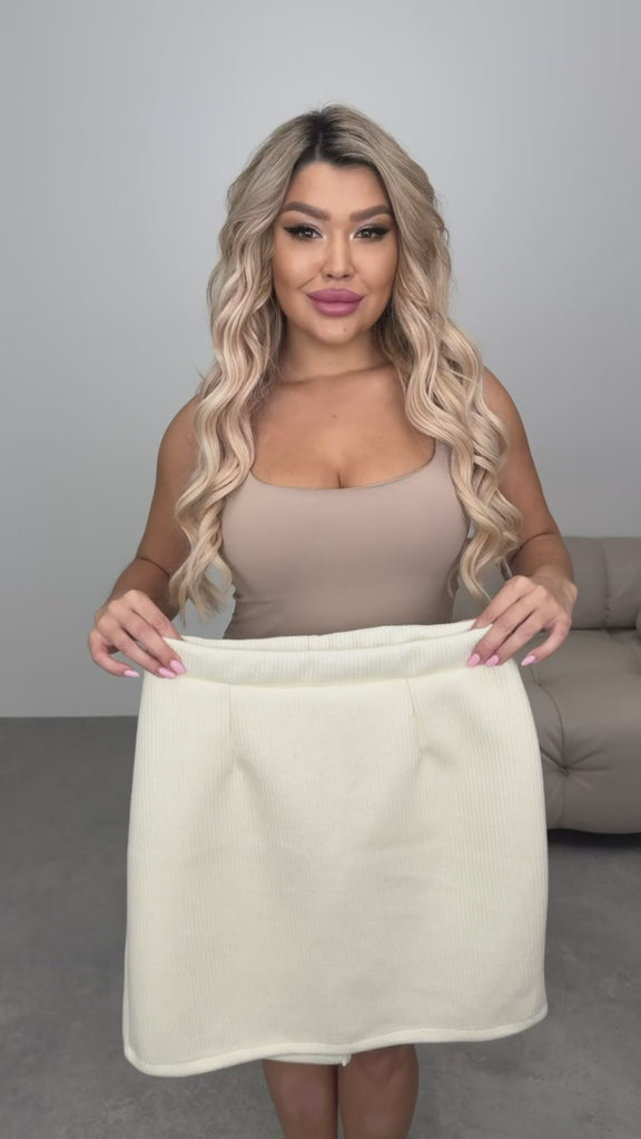 Комплект от жилетка без закопчаване с колан и къса пола, изработени от мек кашмирен трикотаж. Леката и топла материя осигурява комфорт, а елегантният дизайн прави комплекта подходящ както за ежедневни, така и за по-официални визии.
