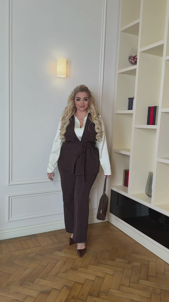 Елекът е с колан от същата материя за перфектно прилягане, панталоните са прави с еластична талия за комфорт, а блузата с яка завършва елегантната визия.