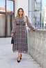 Разкроена рокля от шифон с интересен десен и миди дължина. Талията и ръкавите са на ластик, което осигурява удобство и подчертава фигурата. Дългите ръкави с ластик придават стил, а скритият цип на задната част улеснява обличането. Идеален избор за елегантен и модерен външен вид.