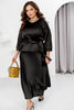 Комплект в две части – елегантен празничен костюм с пола, изработен от луксозен материал, който ще бъде идеалният ви избор за новогодишните празници. Съчетава изтънченост и комфорт, като ви превръща в звезда на всяко тържествено събитие. Блузата с V-образно деколте акцентира на зоната на деколтето, придавайки женственост. Спуснатата линия на раменете и ръкавите с дължина 3/4 и маншети с копчета осигуряват стил и удобство. Дългата пола с еластична талия удобно се прилепва по фигурата, а включеният текстилен колан акцентира на талията и завършва визията. Този костюм е създаден, за да се чувствате уверени и луксозни на Нова година или всяко специално събитие.