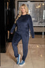 Кадифен комплект със свободен силует, съчетаващ комфорт и блясък. Суитшъртът е с дълъг ръкав, декориран с лампаси и надпис от стразове, а панталоните с ластичен колан, маншети и лампаси по дължината подчертават и издължават фигурата. Подходящ както за ежедневие, така и за по-стилен casual вид, лесно се комбинира с различни обувки.