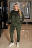 Кадифен комплект със свободен силует, съчетаващ комфорт и блясък. Суитшъртът е с дълъг ръкав, декориран с лампаси и надпис от стразове, а панталоните с ластичен колан, маншети и лампаси по дължината подчертават и издължават фигурата. Подходящ както за ежедневие, така и за по-стилен casual вид, лесно се комбинира с различни обувки.