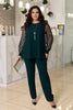 Невероятно женствена визия. Комплектът включва блуза и панталон. Блузата се закопчава с копче на гърба, а акцентът са широките ръкави от мрежа със сребрист блясък, които създават нежно сияние. Комплектът подчертава вашия стил, увереност и изискан вкус.