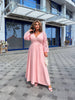 Елегантна дълга рокля, изработена от софт-коприна, с вложки от мрежа с десен, които придават стил и изящество. Роклята се облича на принципа на "прегърни ме", което позволява регулиране на прилягането по тялото. Ръкавите са с дължина 61 см от рамото, а в долната част има еластична лента, която осигурява удобно прилягане. Дължината на роклята е 147 см, което я прави перфектен избор за специални поводи и вечерни излизания.