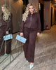 Стилен комплект от велур – бомбер и панталон, който изглежда луксозно и стои перфектно по фигурата. Замшата върху плътна стреч основа се разтяга, оформя силуета и осигурява комфорт, а панталонът е по тялото в горната част и прав, свободен надолу, с прошити ръбове за издължаващ ефект, ластична талия и гайки за колан. Бомберът е с цип, джобове, вградени подплънки на раменете и ластици в долната част и ръкавите, което позволява да се носи и като леко яке.