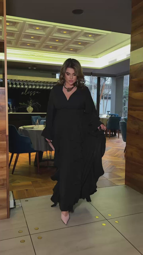 Дълга рокля, която перфектно прилепва по фигурата и подчертава талията благодарение на прошити ластици, които нежно обгръщат тялото без да притискат. Полата е украсена с вертикални волани – тренд на сезона, които придават лекота и допълнителен чар на визията.
