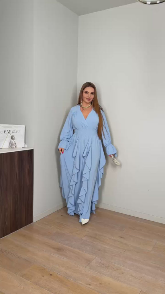 Дълга рокля, която перфектно прилепва по фигурата и подчертава талията благодарение на прошити ластици, които нежно обгръщат тялото без да притискат. Полата е украсена с вертикални волани – тренд на сезона, които придават лекота и допълнителен чар на визията.