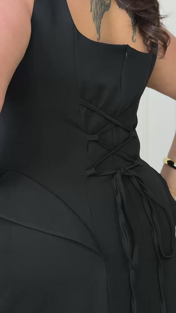 Декоративните „криле“ визуално издължават силуета и подчертават талията, а закопчаването с цип и корсетно връзване отзад осигурява перфектно прилягане. Сваляемият кейп позволява да променяте визията според настроението — модерен акцент за всяка специална поява
