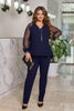 Дамски панталонен костюм, създаден с внимание към стил и комфорт. Блузата е с полуприлепнал силует, V-образно деколте и леко спуснати ръкави, изработена от мека мрежа за допълнителен чар. Елегантният дизайн гарантира удобство и увереност във всеки момент.