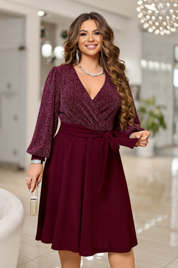 Елегантна дамска рокля от креп-дайвинг с люрекс. Предната част на роклята е с ефект на пресичане, а комплектът включва подвижен колан от същата материя. В такава рокля всяка жена ще се чувства като истинска дама и кралица на вечерта, с лекота, нежност и елегантност.