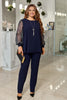 Невероятно женствена визия. Комплектът включва блуза и панталон. Блузата се закопчава с копче на гърба, а акцентът са широките ръкави от мрежа със сребрист блясък, които създават нежно сияние. Комплектът подчертава вашия стил, увереност и изискан вкус.