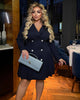 Рокля-сако с двуредово закопчаване на копчета и скрито вътрешно копче, което осигурява изчистен вид. Асиметричната талия визуално издължава краката и прави силуета по-строен. Полата е разкроена с плисировка в долната част, а дългият ръкав завършва с три копчета за елегантен и стилен акцент.