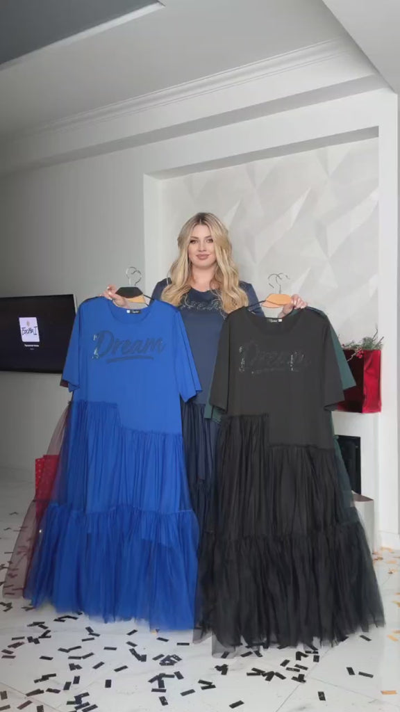 Роклята изработена от висококачествен италиански трикотаж с ефирен тюл отгоре, създаващ модерен обем и леко блестящо мерцане. Блестящият надпис „Dream“ добавя гламурен акцент, а свободният силует с ръкав до лакътя и кръгло деколте осигурява комфорт и стил.