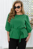 Едноцветна блуза с изчистен дизайн и 3/4 ръкави с маншети на копчета. Моделът може да се носи както със свободен силует, така и подчертана в талията с текстилния колан, включен в комплекта. Подходяща за комбинация с различни дрехи и аксесоари.