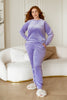 Мек и удобен домашен комплект от кадифе, който ще Ви осигури максимален комфорт и стил. Включва едноцветни джогър панталони с ластик, джобове и маншети, както и изчистен суичър в тон с декоративен принт и ръкави реглан с маншети. Идеален за уютни дни вкъщи и стилна домашна визия.
