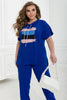 Всекидневен комплект с принт. Лек и удобен, този комплект е идеален за комфорт през целия ден. Тениската с подвижна декоративна връзка в полукръгло деколте и с къси ръкави придава изчистен и стилен вид. Ярката апликация добавя интересен акцент. Панталоните с прав силует и ластиик в талията предлагат удобство и свобода на движение, а страничните джобове са практично допълнение. На модела е показан размер 2XL-3XL.
